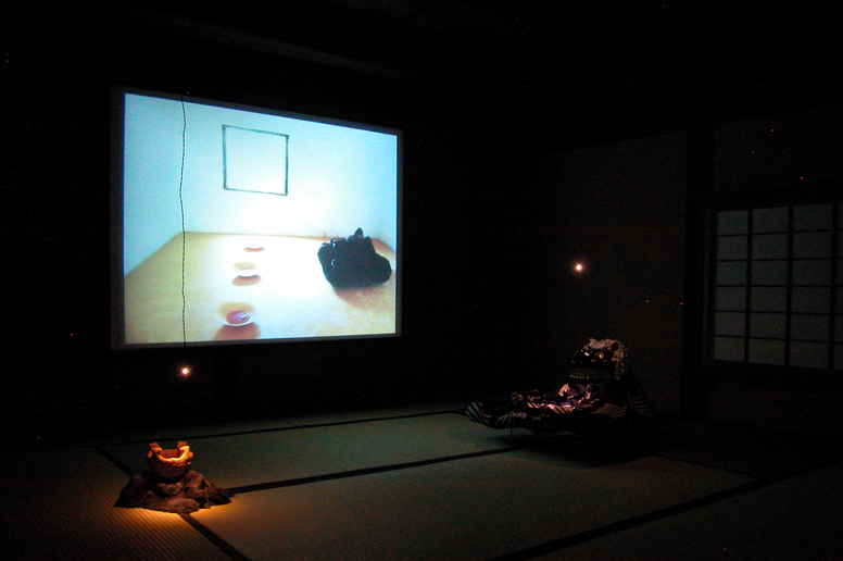 この空間造形作品は、森と人とが交感することに関わるイメージの創出であり、古人が神話から得ていた精神的糧を現代に再生し、新たな形で機能することを願って設えた。アイヌの山の神である罷をモチーフとした作品映像、岩手県花巻市に伝わる早池峰山伏神楽の権現像( 吉田功氏作)、花巻市出土の縄文の熊意匠を模した土器、この3 点のオブジェによるインスタレーション作品である。