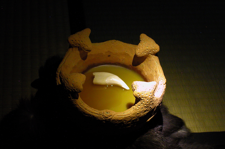 ここに展示されている権現様は、大償流土沢神楽顧問の吉田功氏の作品である。私は、このシシ頭を熊頭と見る。マタギは、熊をイタズやシシと呼び、狩猟後、山の神迎えの儀式では、その頭に山の神が宿るとして崇めてきた。アイヌも羆を山の神として神送りを行う。ここに設えた空間は、北海道音威子府の森の精神と東北の森の精神とが、神話的な時間を経て現代に結びあう場である。縄文人は、しょっぱい河(津軽海峡)を行き来していた。私もこの河を渡り、山の神を訪ねて東北の取材に通った。早池峰山麓の古い地層には、熊意匠の神器の痕跡が残されている。それを、モチーフに握ね上げた土器には、早池峰神社の蜂蜜を満たし、山形の小国で行われた「熊まつり」の日にマタギから譲り受けた熊の牙を入れた。東北と北海道は、古い森の文化を共有している。それは、オホーツク海を経てユーラシア、北米へと繋がる北方圏の「森の思想」である。「けはいをきくこと」シリーズは、壊れかけた現代社会の空間を再生するイメージの創出を目指し、フィールドワークとそこで出会う協力者とともに制作を続けている。