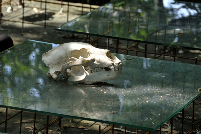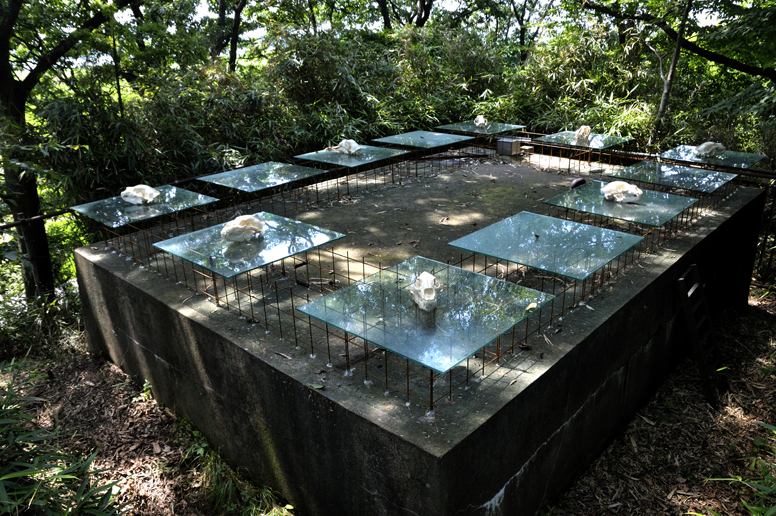 ヒグマ頭骨レプリカ、ガラス、鉄筋、コンクリート製貯水槽