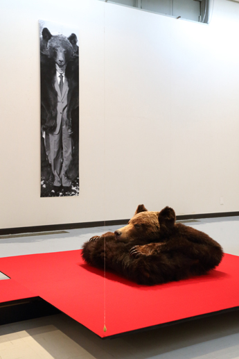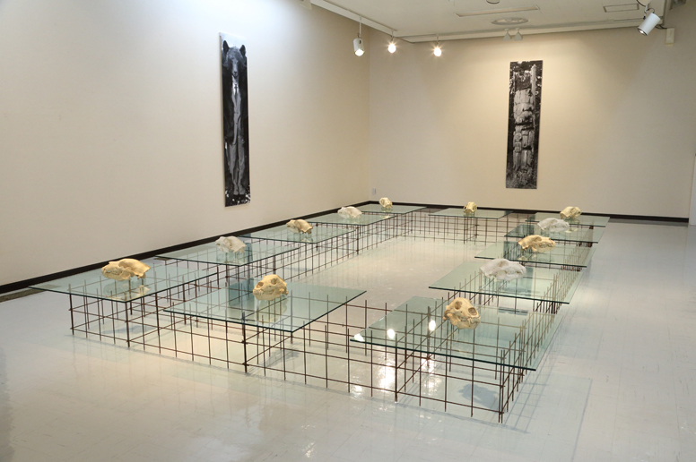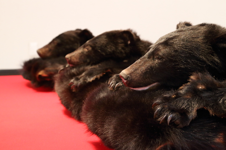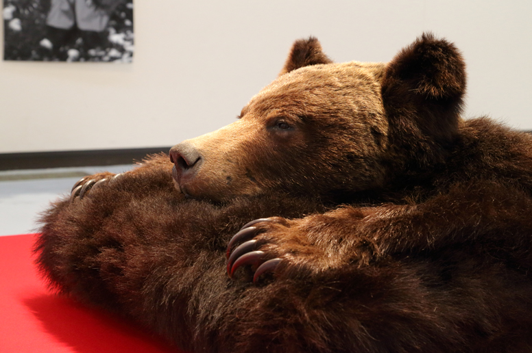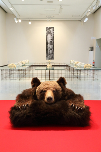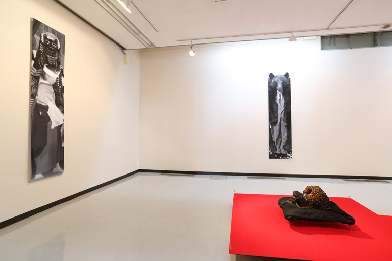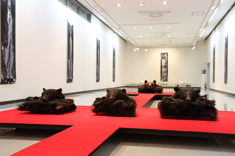 写真、権現様*、緋毛氈、ツキノワグマ毛皮、ヒグマ毛皮、麻糸、 蜜蝋、ガラス、鉄、ヒグマ頭骨(レプリカ・樹脂)