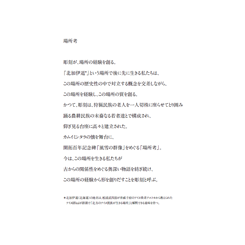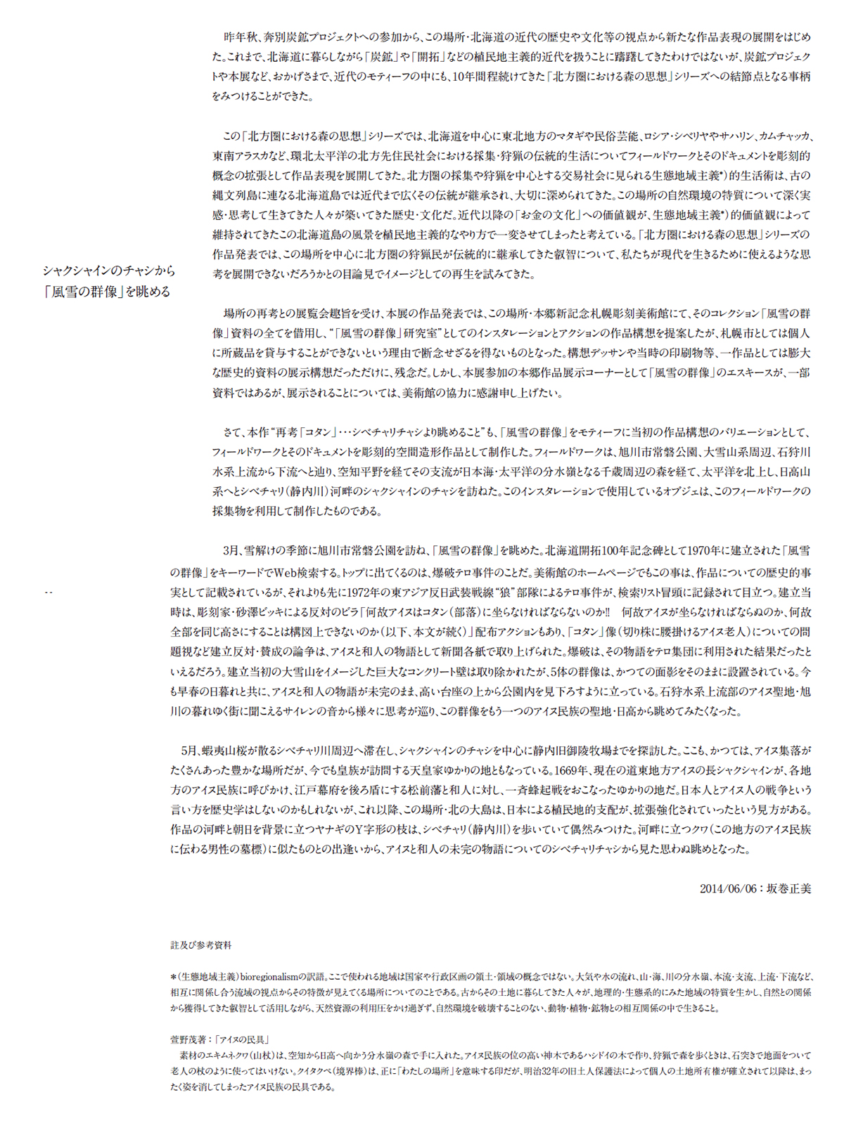 本郷新記念札幌彫刻美術館「Our Place」展」にて、「風雪の群像」に関わる物語を素材とした作品「再考“コタン”・・・シベチャリチャシより眺めること」坂巻正美(インスタレーション)発表