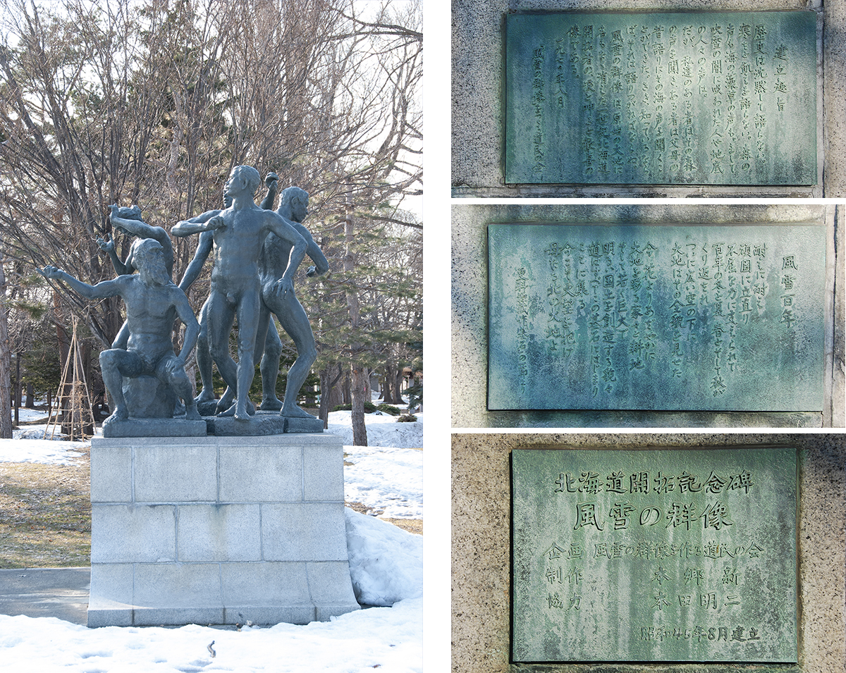 「大地」「朔風」「コタン」「沃野」「波濤」の5体の群像が高さ1.8メートルの台座上に、高さ7メートル幅6.2メートルのコンクリート製バックボーンを背景として「風雪の群像」が建立された。