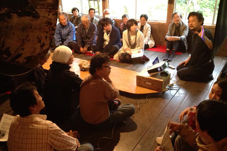 考古学と人類学2名のゲストの話を聞きながら、奥能登の里山集落へ里海の歴史民俗資料を運び、それらを作品素材としたインスタレーション空間にその場所を生きる地区の皆さんと集い、車座で地区の皆さんと対話する会