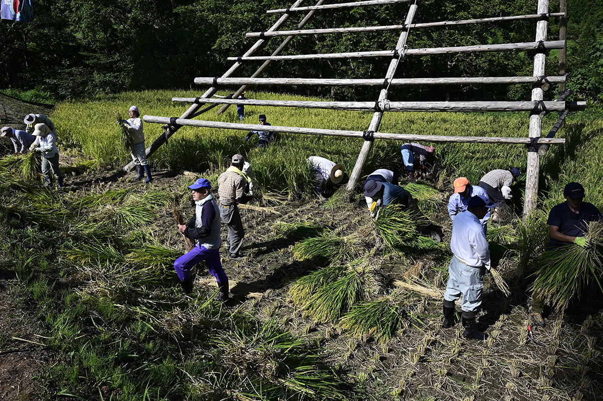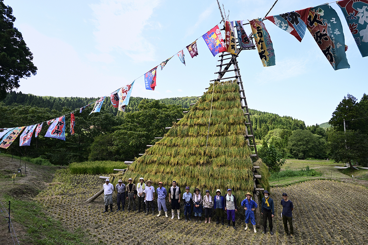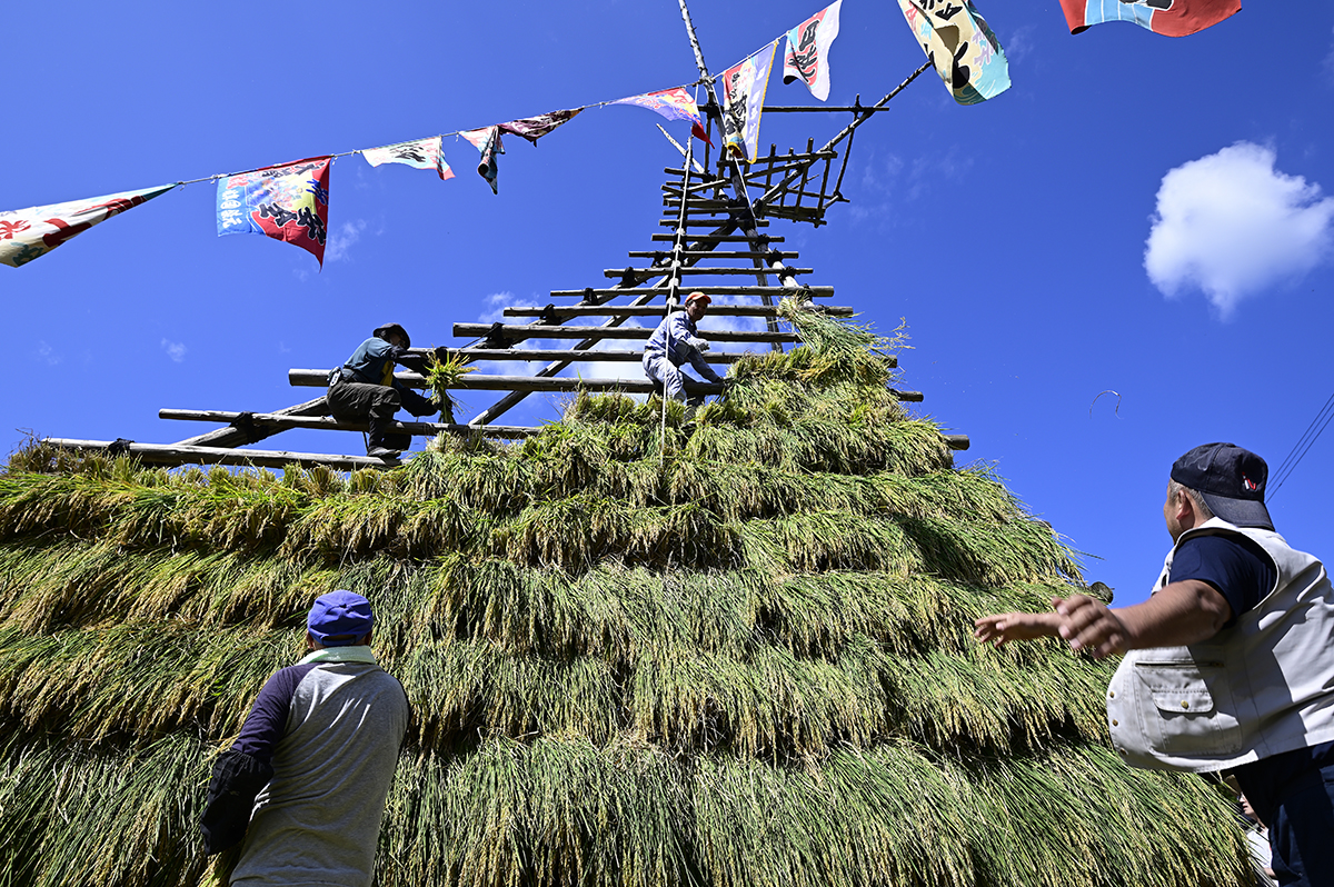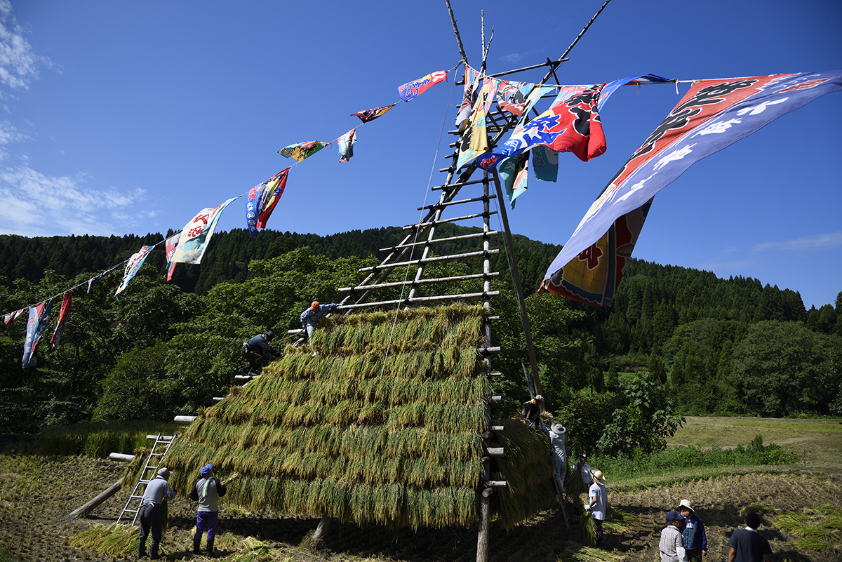 旧北山分校前の棚田再生は、昔の風景が新たによみがえる空間芸術の実践です。今年の餅米作りは、水守役のじいちゃん、北山ガールズの田の草取り、電気柵張りのおじさん達、北山集落はじめ、みなさんの手入れのおかげで、イノシシにも荒らされず、晴天・豊作の稲刈りでした。稲穂の櫓が、あっという間に積み上がる大収穫でした。おなじみの大漁旗をはためかせ、祝祭の空間ができあがりました。「祝~い♪ 愛で田~や黄金のお餅~♪なるなり~♪いいじ~♪北山~♪」と歌いたくなるような気持ちの良い豊年満作の餅米作りでした。