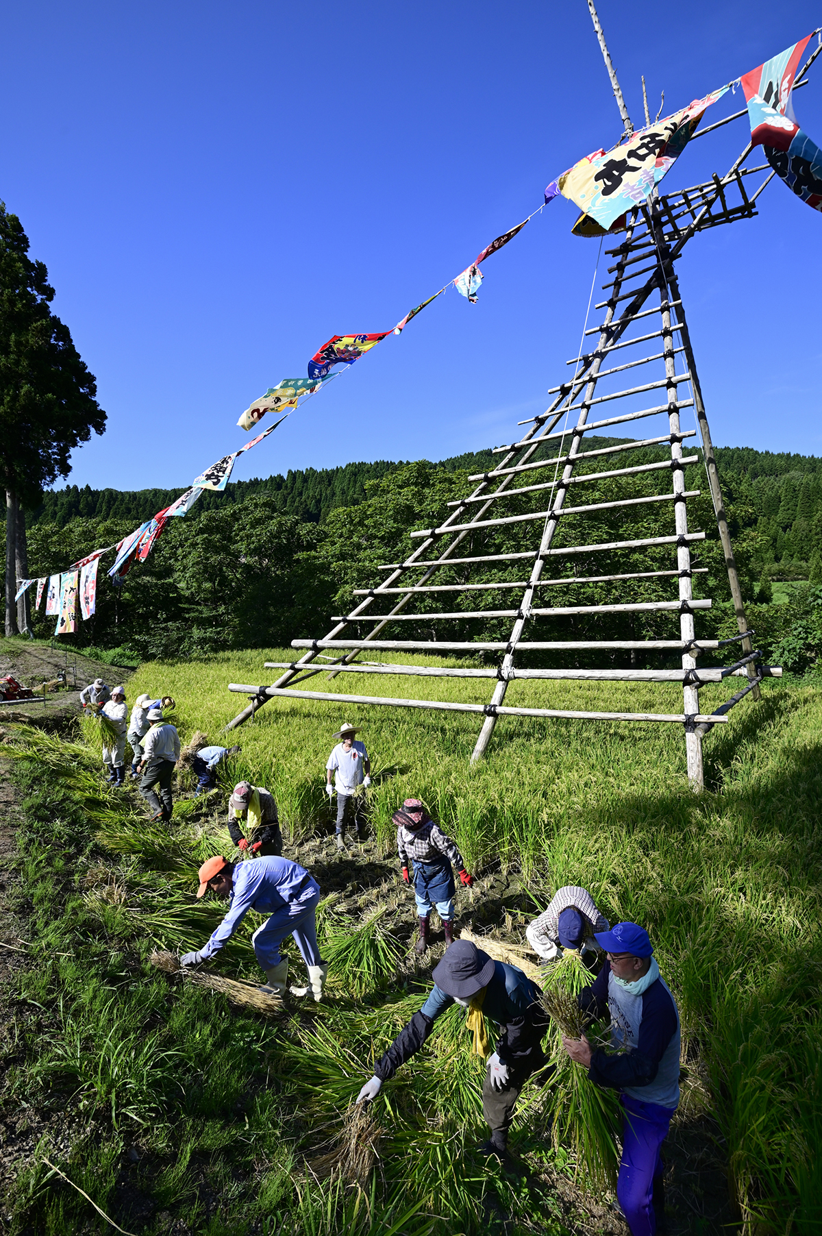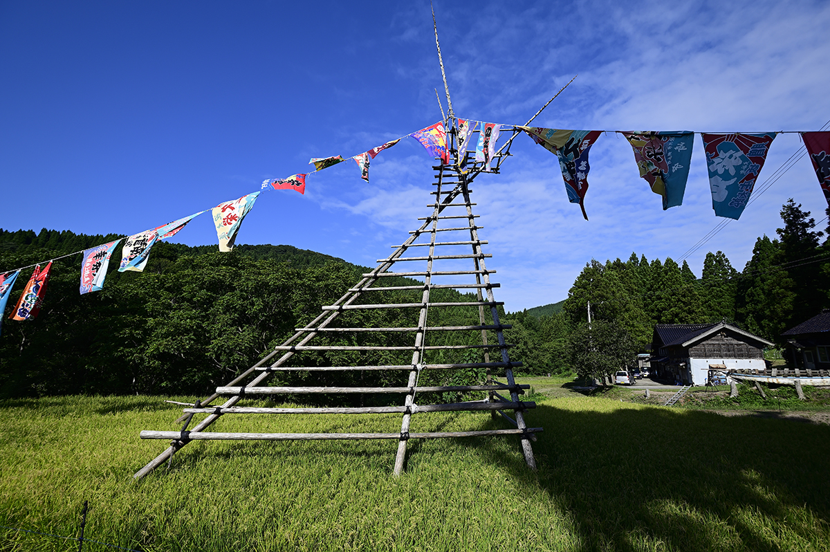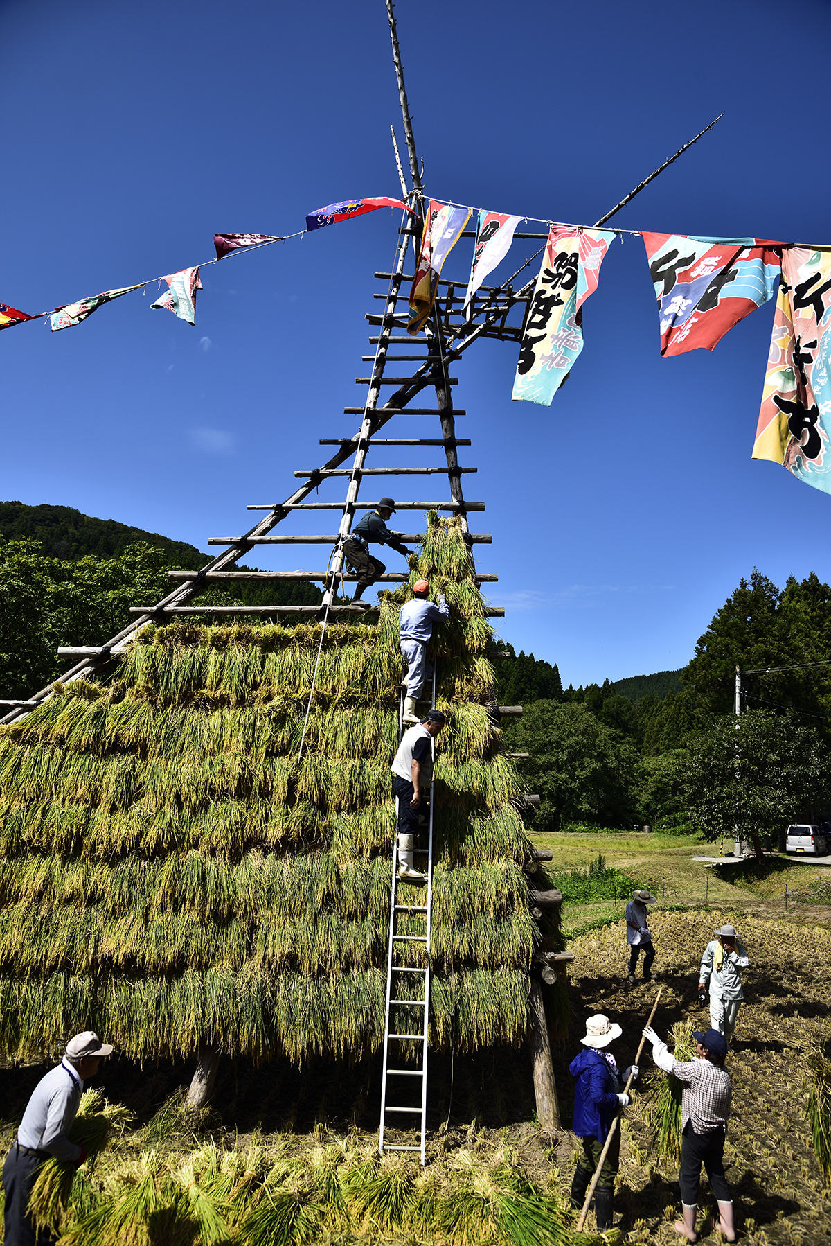 旧北山分校前の棚田再生は、昔の風景が新たによみがえる空間芸術の実践です。今年の餅米作りは、水守役のじいちゃん、北山ガールズの田の草取り、電気柵張りのおじさん達、北山集落はじめ、みなさんの手入れのおかげで、イノシシにも荒らされず、晴天・豊作の稲刈りでした。稲穂の櫓が、あっという間に積み上がる大収穫でした。おなじみの大漁旗をはためかせ、祝祭の空間ができあがりました。「祝~い♪ 愛で田~や黄金のお餅~♪なるなり~♪いいじ~♪北山~♪」と歌いたくなるような気持ちの良い豊年満作の餅米作りでした。
