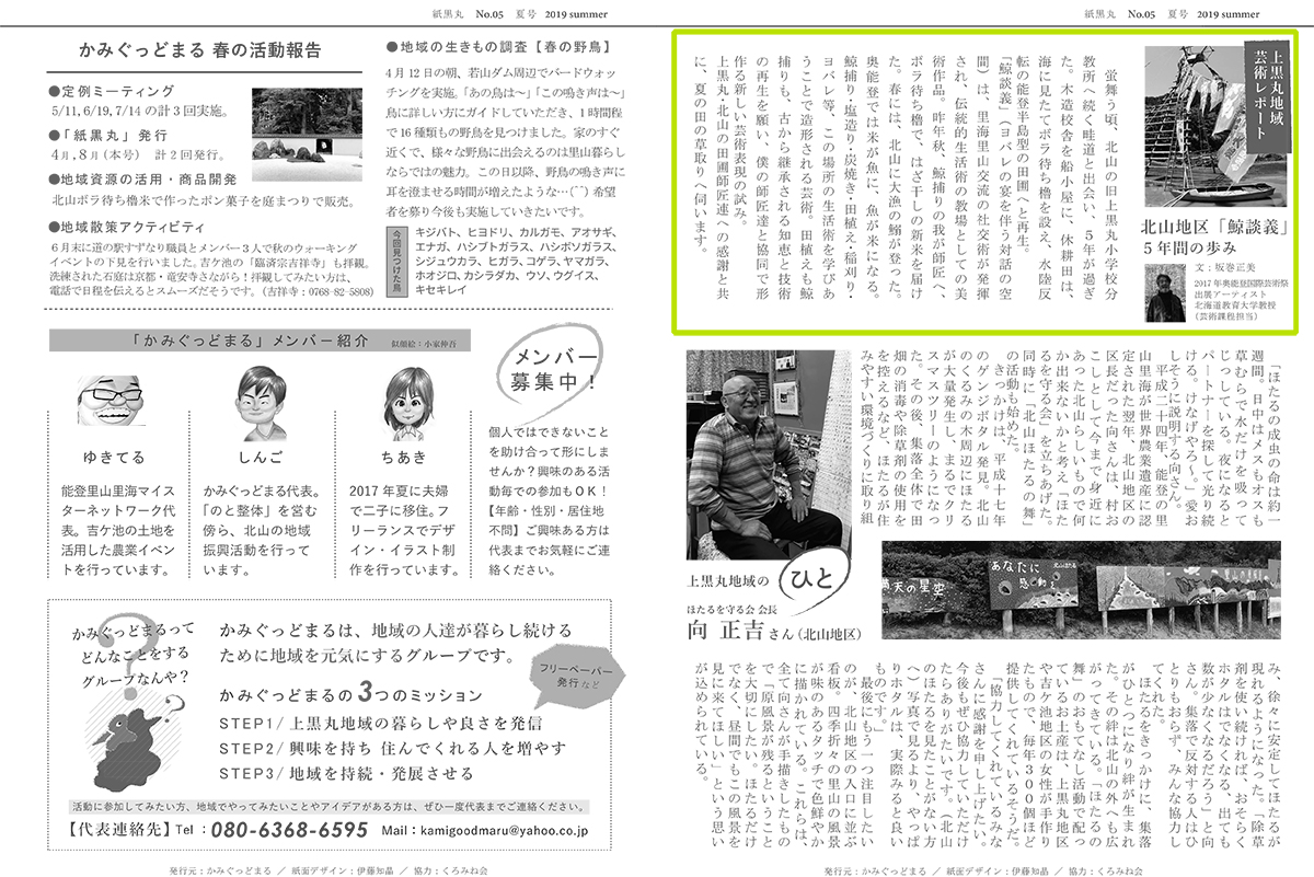 そして今も、「鯨談義」から始まった里海と里山を生きる創造性豊かな人たちの交流が続いています。今日も、大量の鰯が山里に届けられました。鯨も水揚げする矢波の網元さんからです。晩秋に作品の田圃で収穫した里山の新米を届けたものが、また海の幸となって回ってきたような出来事です。今年もまた田植えに伺います。昨年から上黒丸・北山集落のみなさんと一緒に米作りをしています。