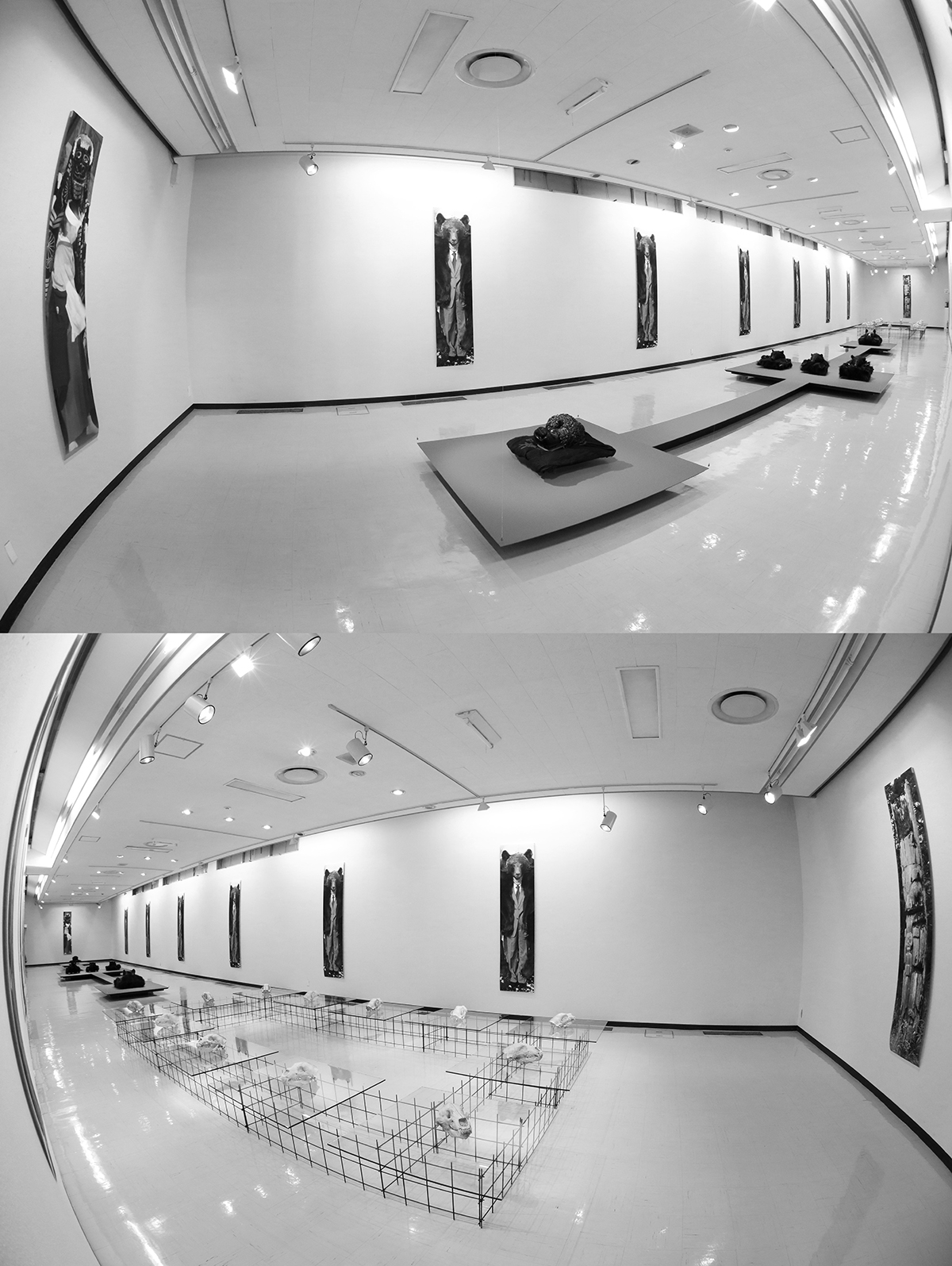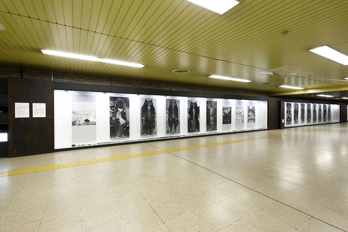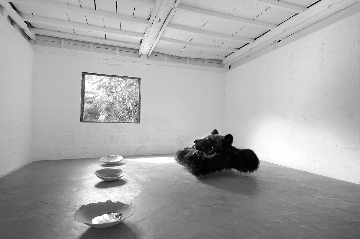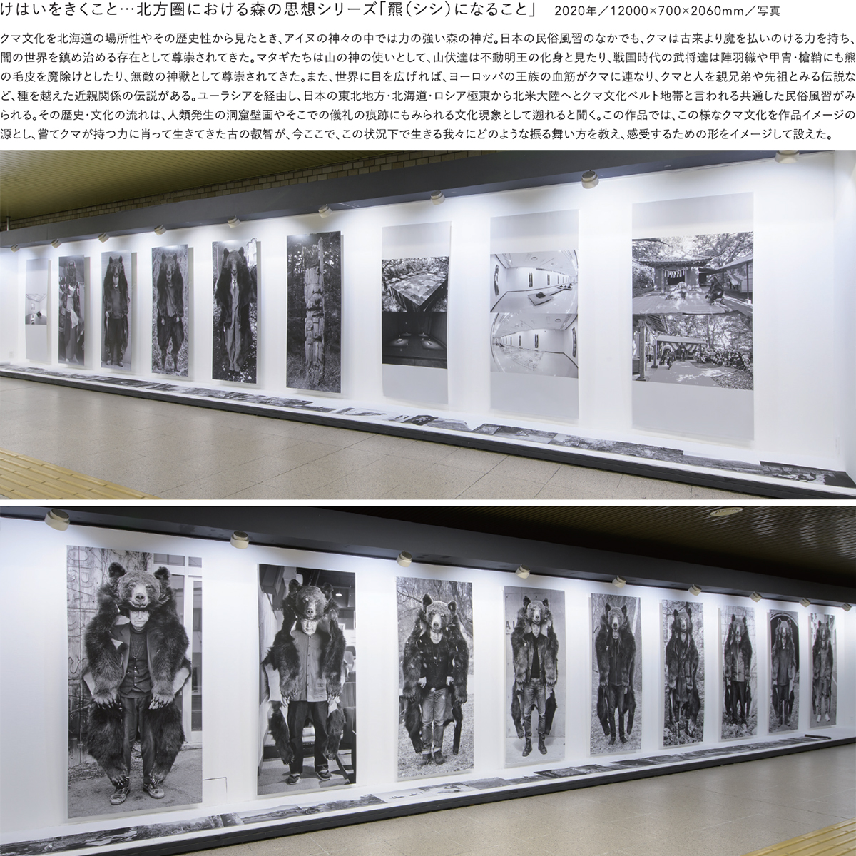 この作品では、この様なクマ文化を作品イメージの源泉とし、嘗て熊が持つ力に肖って生きてきた人類最古の叡智を、今ここで、この疫病蔓延の状況下で生きる我々が、どのような振る舞い方として使おうとするのか、思考し、感受するための形・空間をイメージしてこの作品を設えさせてもらった。