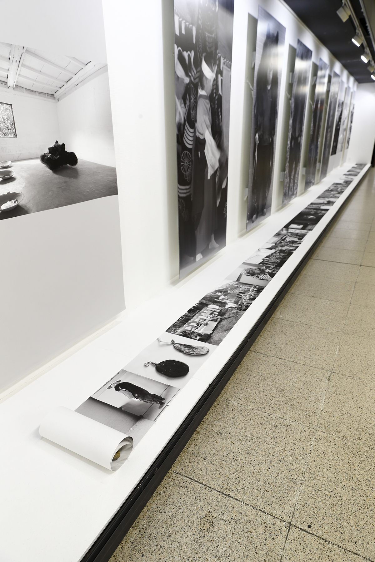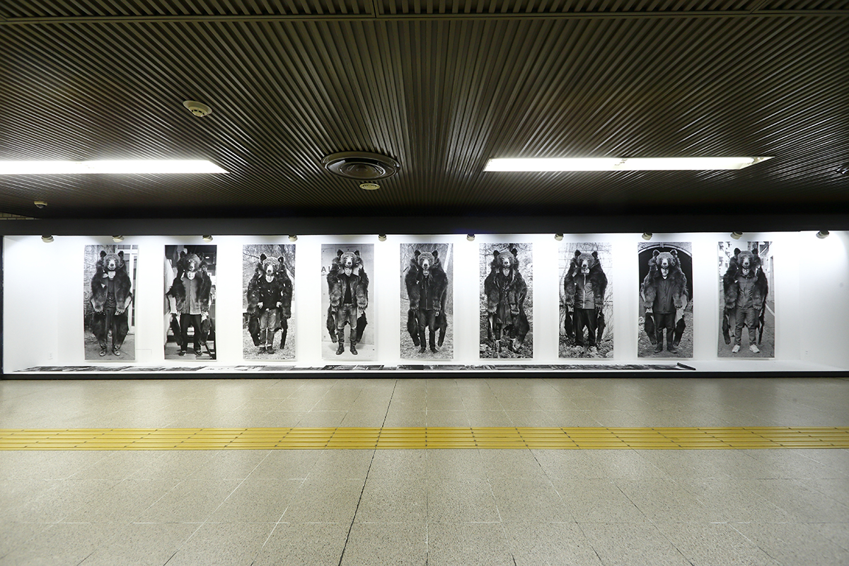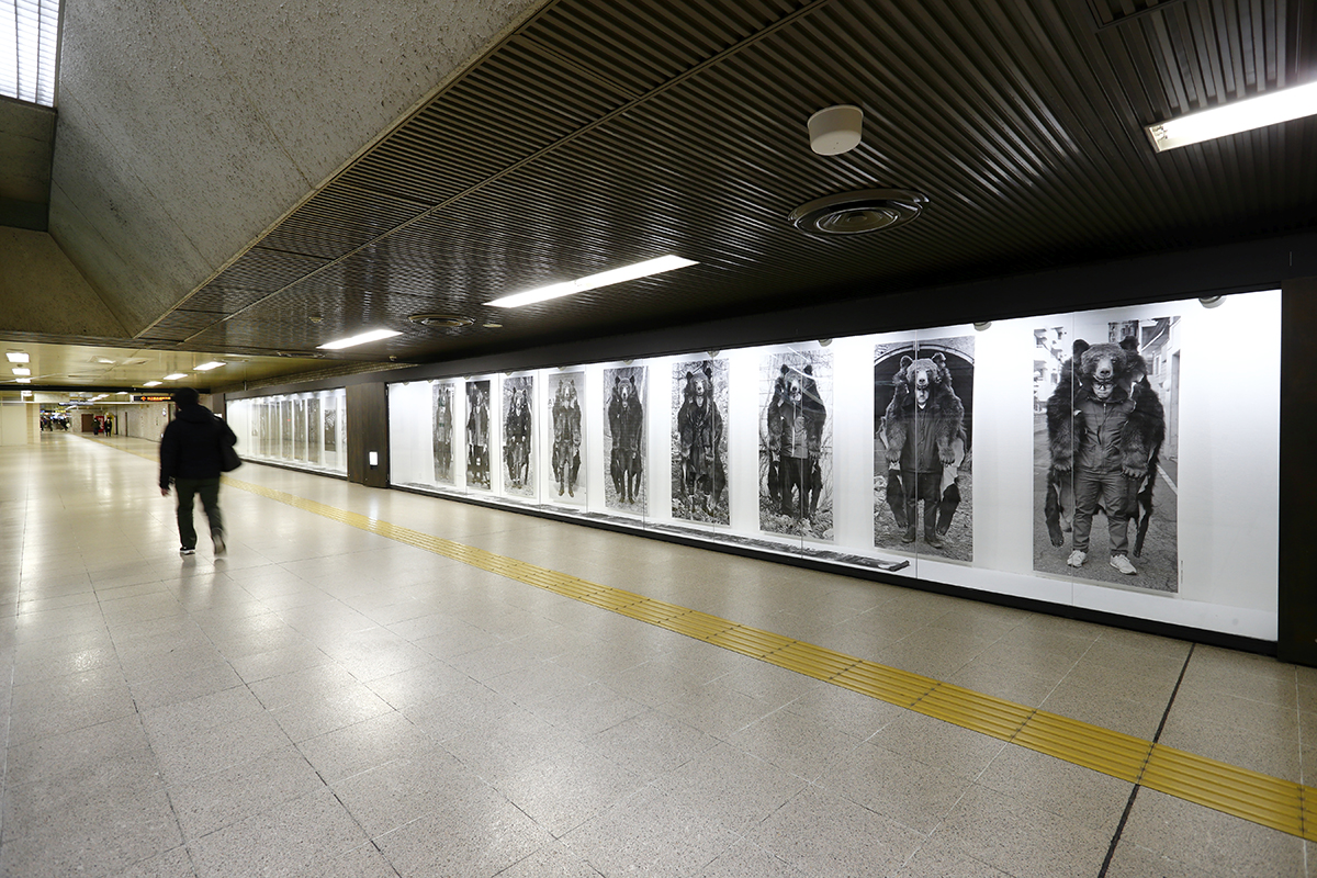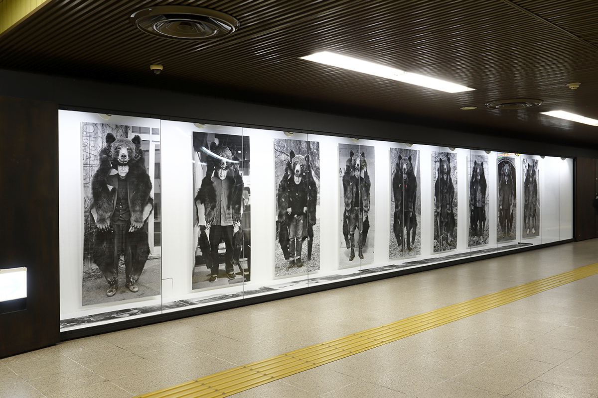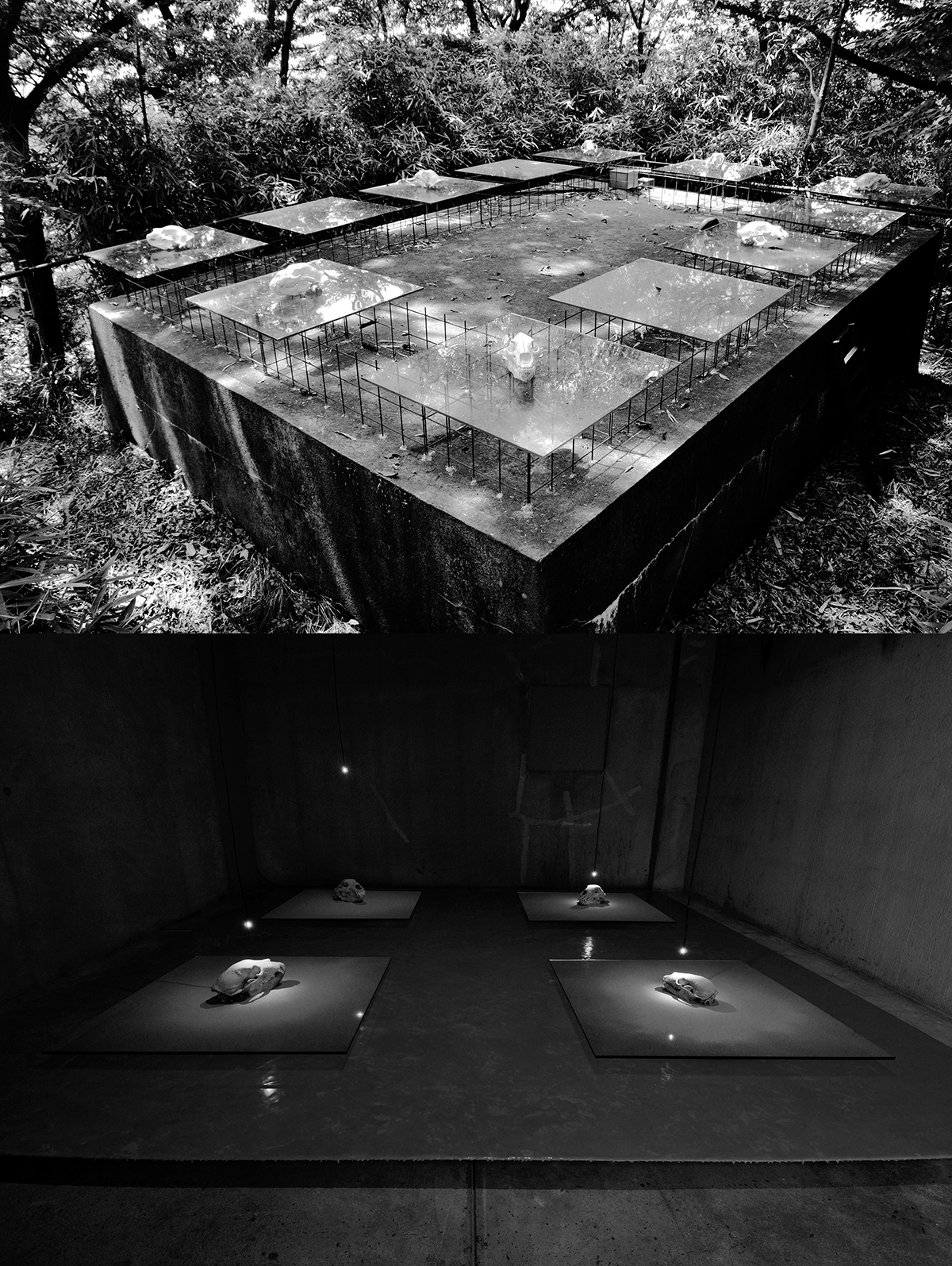 この作品では、この様なクマ文化を作品イメージの源泉とし、嘗て熊が持つ力に肖って生きてきた人類最古の叡智を、今ここで、この疫病蔓延の状況下で生きる我々が、どのような振る舞い方として使おうとするのか、思考し、感受するための形・空間をイメージしてこの作品を設えさせてもらった。